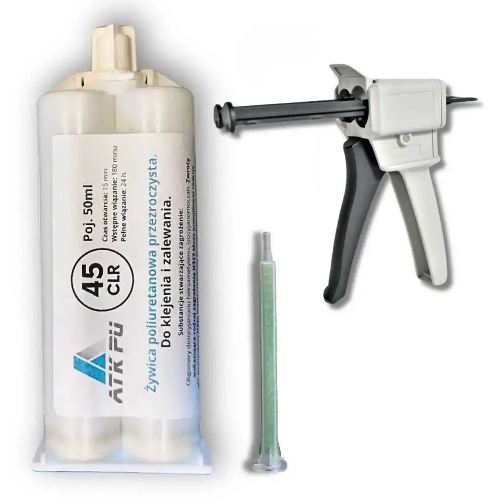 - Przygotowanie produktu: Umieść kartusz ATK PU45 w wyciskaczu w proporcji 1:1. Załóż dyszę mieszającą.
