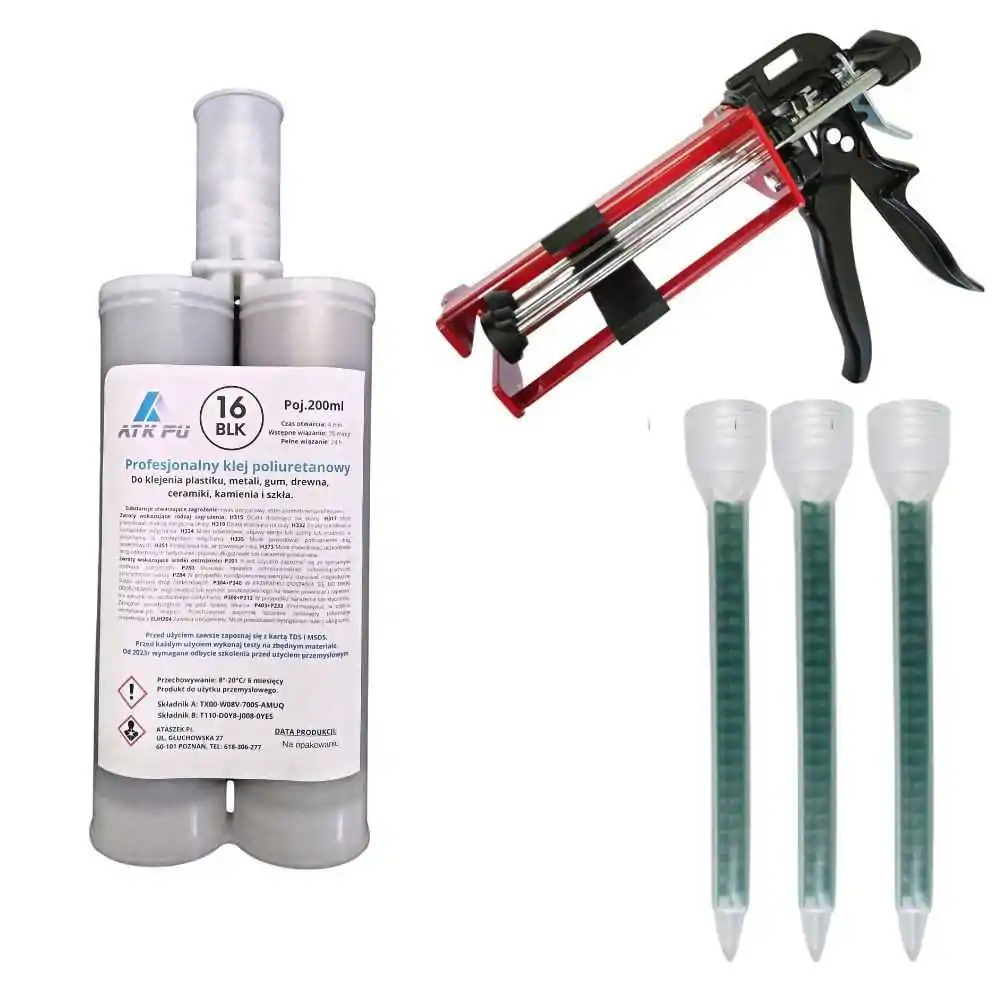 - Przygotowanie kleju: Umieść kartusz ATK PU16 w wyciskaczu. Zdejmij zatyczkę i nałóż mikser statyczny. Wyciśnij i odrzuć pierwsze 1-2 cm kleju.