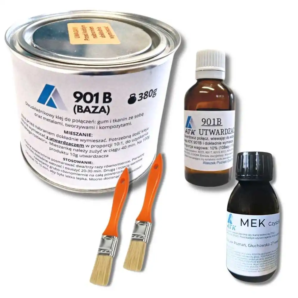 - W przeciwieństwie do klejów jednoskładnikowych (np. butapren), ATK 901B jako produkt dwuskładnikowy tworzy spoinę o nieporównywalnie wyższej sile, odporności na wodę i temperaturę, gwarantując wieloletnią trwałość naprawy.