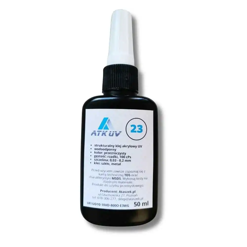 - W przeciwieństwie do klejów cyjanoakrylowych ("Kropelka"), ATK UV23 nie pozostawia białego nalotu i nie matowieje z czasem.