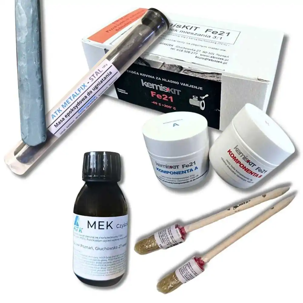 Kompletny zestaw do naprawy zbiorników metalowych umożliwia szybkie i trwałe usunięcie nieszczelności powstałych w wyniku korozji lub uszkodzeń mechanicznych. System oparty na kompozycie FE21 oraz masie METALFIX gwarantuje pełną szczelność konstrukcji przemysłowych oraz zbiorników ciśnieniowych. Produkt charakteryzuje się doskonałą przyczepnością do stali, stali nierdzewnej oraz aluminium, tworząc barierę odporną na wodę i chemię. Jest to optymalne rozwiązanie wszędzie tam, gdzie tradycyjne spawanie jest niemożliwe lub nieopłacalne.