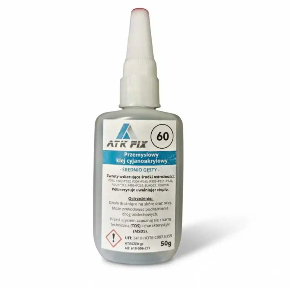 - W przeciwieństwie do standardowych klejów cyjanoakrylowych (typu "Kropelka"), ATK FIX 60 jest oparty na alkoksach, dzięki czemu jest bezzapachowy i nie powoduje białego nalotu, co jest częstym problemem przy tańszych klejach.